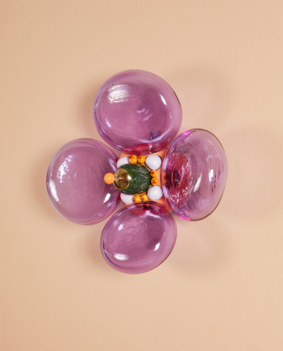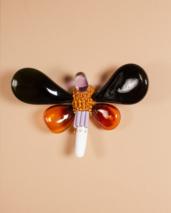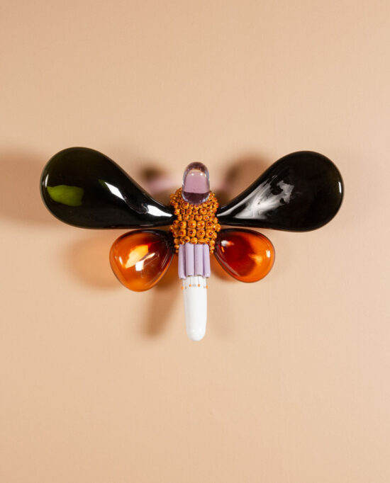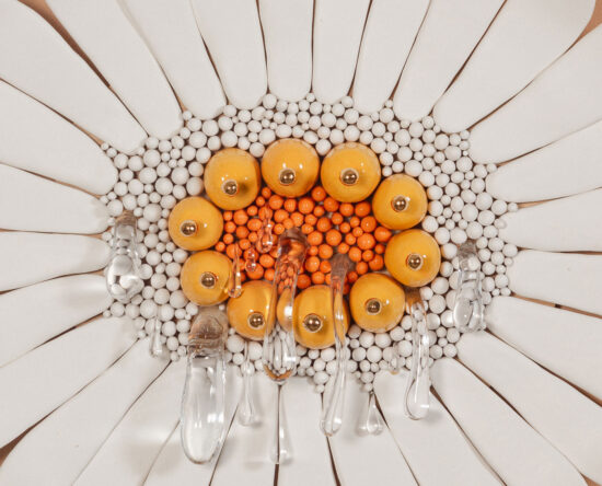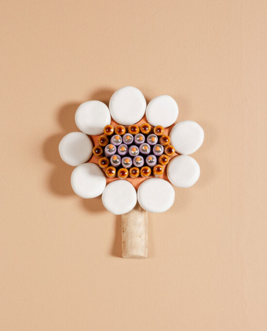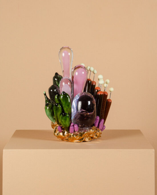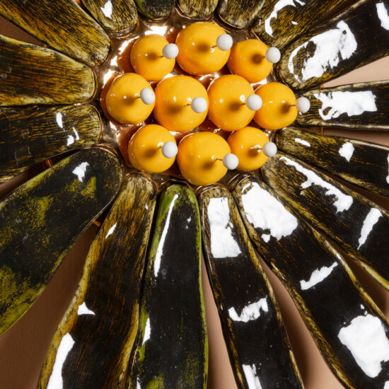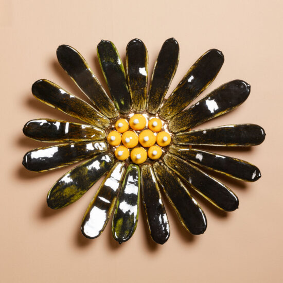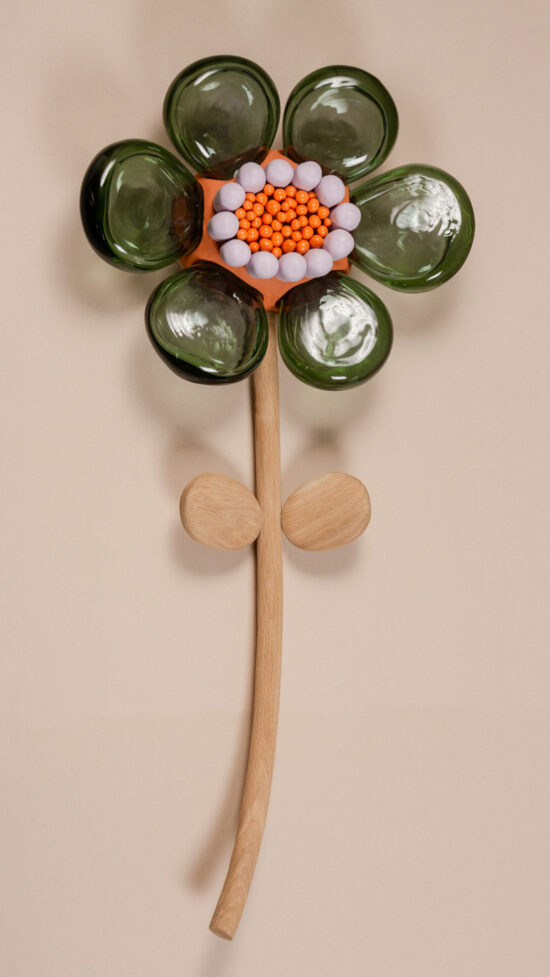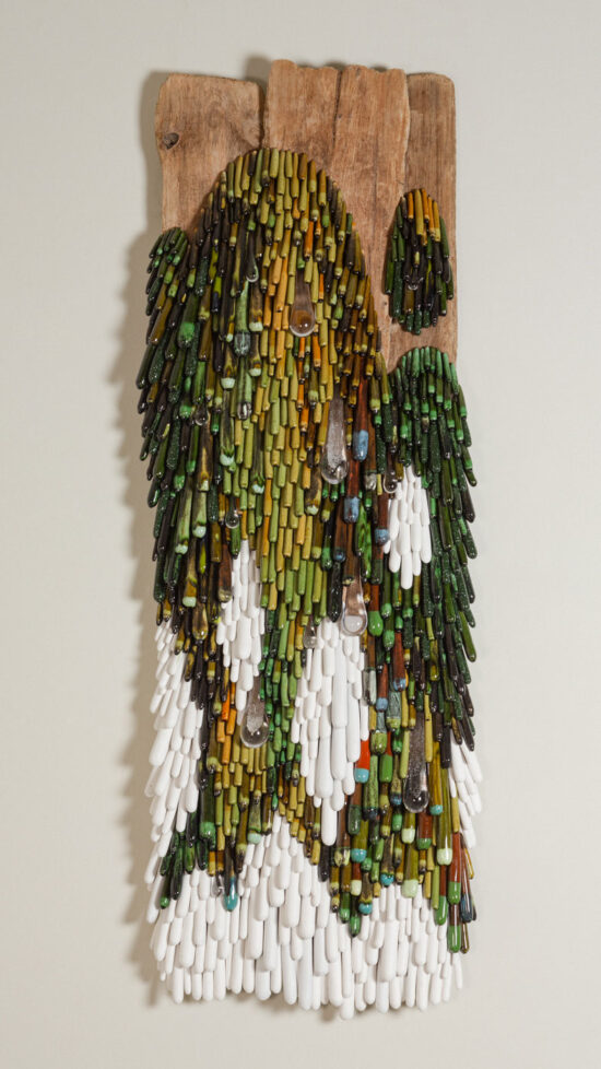 “In the works in the Current exhibition, ceramics and glass meet wood, shaped by nature. In sculptures, the surface made of ceramic parts gives space to the glazes, turning them into picturesque studies of colour. The flowing, miscible glazes and crystals formed in the fires take on the colour brilliance of flora, fauna and minerals.