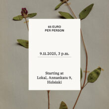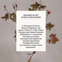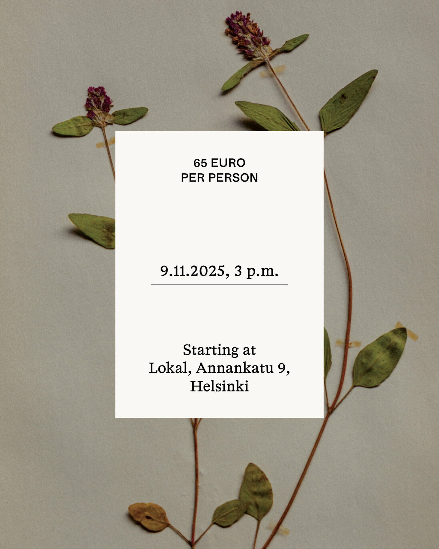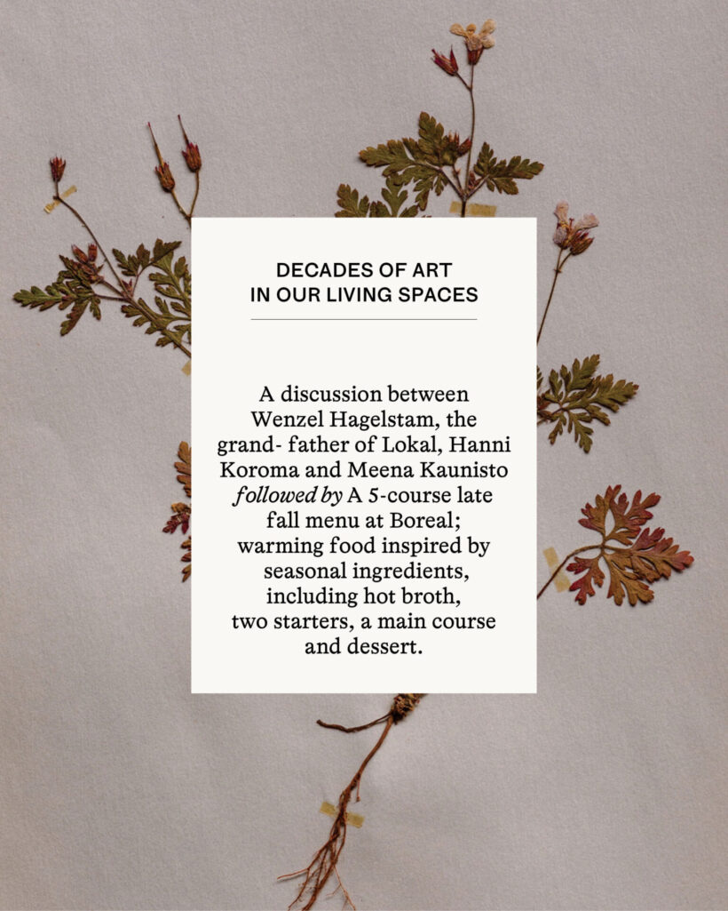 Medium | 3 p.m.: Decades of Art in our Living Spaces – a discussion between Wenzel Hagelstam, the grandfather of Lokal, Hanni Koroma and Meena Kaunisto. 4 p.m.: Late fall menu for Father's Day 9.11.; warming food inspired by seasonal ingredients, including hot broth, two starters, a main course and dessert. |