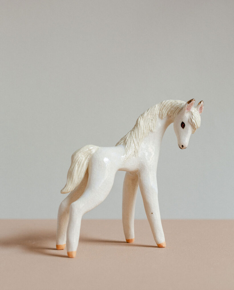 Maisa Majakka (b.1989) is a Helsinki-based visual artist and sculptor. Her figurative ceramic sculptures often depict people, especially girls and women. The works refer to the artist’s own experiences, but also real places, modern phenomena and recognizable figures of popular culture. Majakka is inspired by mundane experiences of freedom, the frantically transformative nature of life, emotional ambivalence and the female point-of-view. The narrative of her works is clear but invites interpretation. Majakka’s career in ceramics begun in 2011 with making her first small ceramic animal figurines. Ever since, they have continued to be a dear and vital part of her practice. The editions of miniature figurines such as dogs, cats and horses contribute to her work as a laboratory of trying out new materials and methods. With the animals, she mixes new bodies of clay and searches for interesting combinations in small scale, in a playful setting.