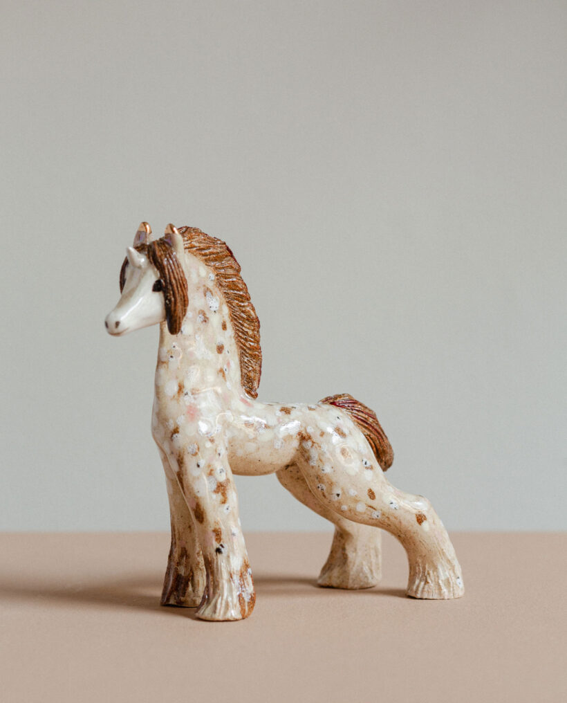 Maisa Majakka (b.1989) is a Helsinki-based visual artist and sculptor. Her figurative ceramic sculptures often depict people, especially girls and women. The works refer to the artist’s own experiences, but also real places, modern phenomena and recognizable figures of popular culture. Majakka is inspired by mundane experiences of freedom, the frantically transformative nature of life, emotional ambivalence and the female point-of-view. The narrative of her works is clear but invites interpretation. Majakka’s career in ceramics begun in 2011 with making her first small ceramic animal figurines. Ever since, they have continued to be a dear and vital part of her practice. The editions of miniature figurines such as dogs, cats and horses contribute to her work as a laboratory of trying out new materials and methods. With the animals, she mixes new bodies of clay and searches for interesting combinations in small scale, in a playful setting.