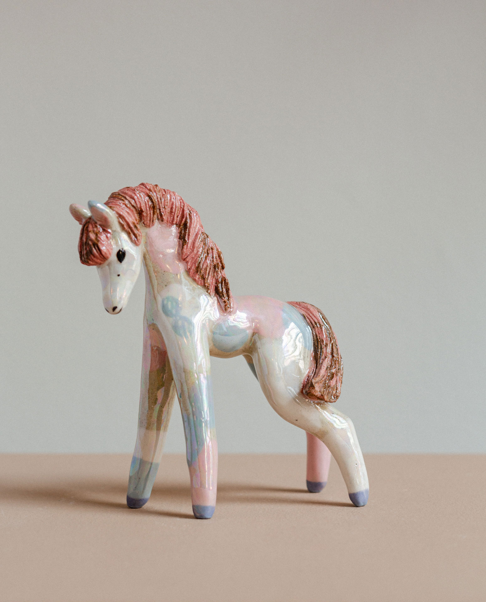Maisa Majakka (b.1989) is a Helsinki-based visual artist and sculptor. Her figurative ceramic sculptures often depict people, especially girls and women. The works refer to the artist’s own experiences, but also real places, modern phenomena and recognizable figures of popular culture. Majakka is inspired by mundane experiences of freedom, the frantically transformative nature of life, emotional ambivalence and the female point-of-view. The narrative of her works is clear but invites interpretation. Majakka’s career in ceramics begun in 2011 with making her first small ceramic animal figurines. Ever since, they have continued to be a dear and vital part of her practice. The editions of miniature figurines such as dogs, cats and horses contribute to her work as a laboratory of trying out new materials and methods. With the animals, she mixes new bodies of clay and searches for interesting combinations in small scale, in a playful setting.