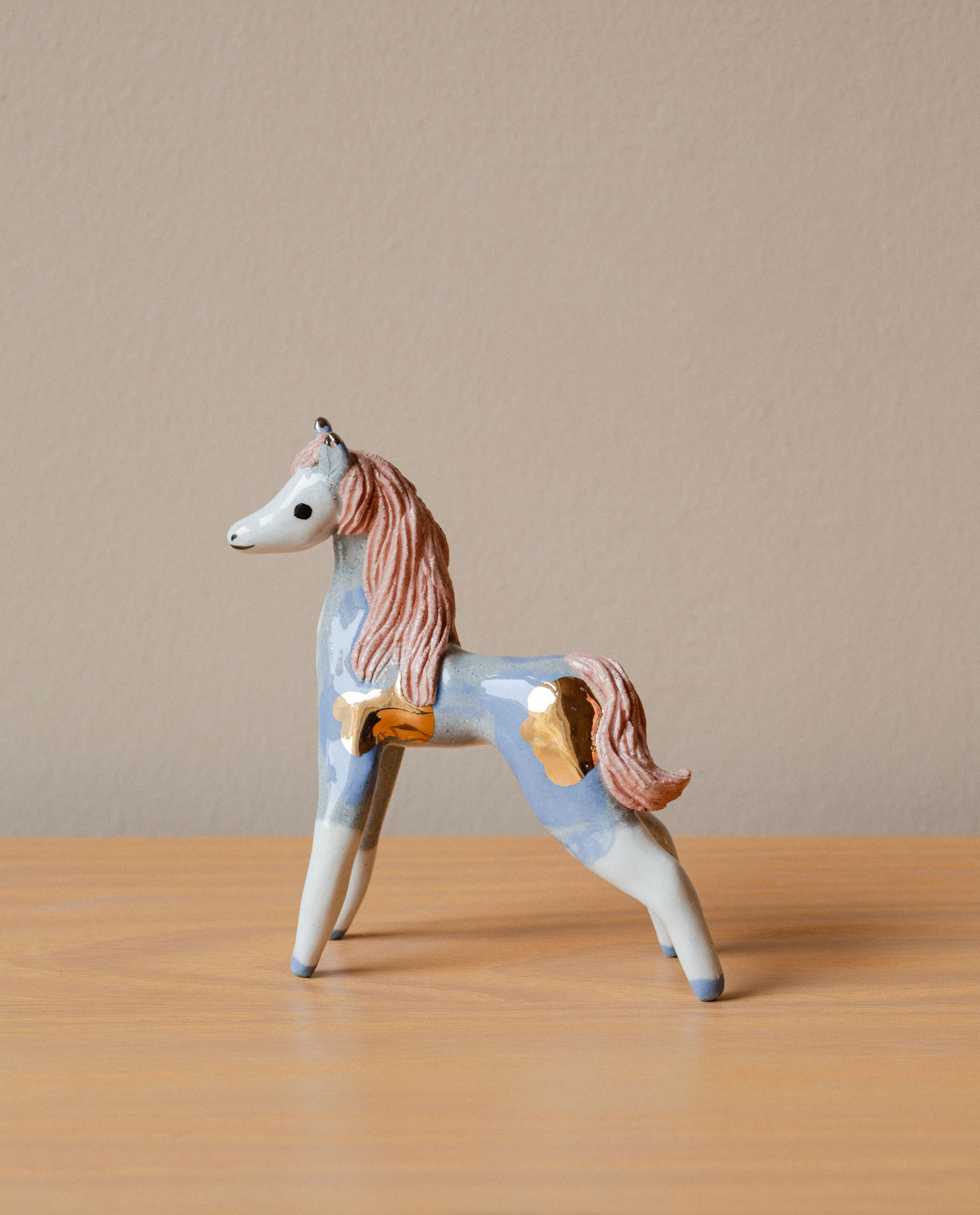 Maisa Majakka (b.1989) is a Helsinki-based visual artist and sculptor. Her figurative ceramic sculptures often depict people, especially girls and women. The works refer to the artist’s own experiences, but also real places, modern phenomena and recognizable figures of popular culture. Majakka is inspired by mundane experiences of freedom, the frantically transformative nature of life, emotional ambivalence and the female point-of-view. The narrative of her works is clear but invites interpretation. Majakka’s career in ceramics begun in 2011 with making her first small ceramic animal figurines. Ever since, they have continued to be a dear and vital part of her practice. The editions of miniature figurines such as dogs, cats and horses contribute to her work as a laboratory of trying out new materials and methods. With the animals, she mixes new bodies of clay and searches for interesting combinations in small scale, in a playful setting.