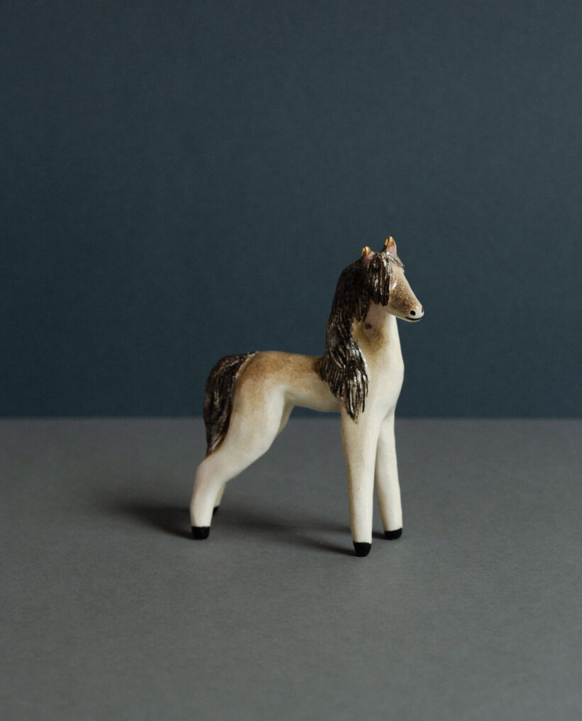 Maisa Majakka (b.1989) is a Helsinki-based visual artist and sculptor. Her figurative ceramic sculptures often depict people, especially girls and women. The works refer to the artist’s own experiences, but also real places, modern phenomena and recognizable figures of popular culture. Majakka is inspired by mundane experiences of freedom, the frantically transformative nature of life, emotional ambivalence and the female point-of-view. The narrative of her works is clear but invites interpretation. Majakka’s career in ceramics begun in 2011 with making her first small ceramic animal figurines. Ever since, they have continued to be a dear and vital part of her practice. The editions of miniature figurines such as dogs, cats and horses contribute to her work as a laboratory of trying out new materials and methods. With the animals, she mixes new bodies of clay and searches for interesting combinations in small scale, in a playful setting.