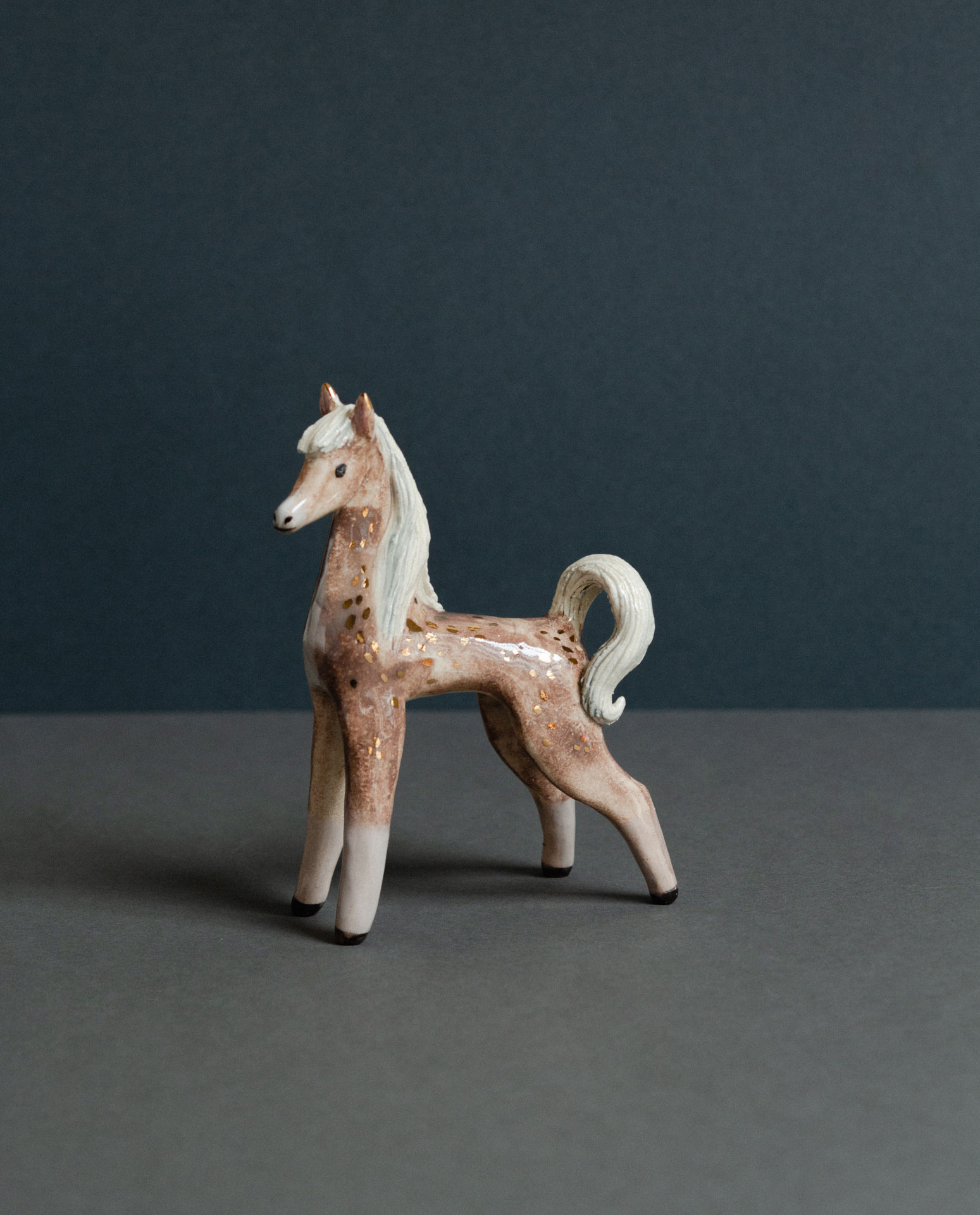 Maisa Majakka (b.1989) is a Helsinki-based visual artist and sculptor. Her figurative ceramic sculptures often depict people, especially girls and women. The works refer to the artist’s own experiences, but also real places, modern phenomena and recognizable figures of popular culture. Majakka is inspired by mundane experiences of freedom, the frantically transformative nature of life, emotional ambivalence and the female point-of-view. The narrative of her works is clear but invites interpretation. Majakka’s career in ceramics begun in 2011 with making her first small ceramic animal figurines. Ever since, they have continued to be a dear and vital part of her practice. The editions of miniature figurines such as dogs, cats and horses contribute to her work as a laboratory of trying out new materials and methods. With the animals, she mixes new bodies of clay and searches for interesting combinations in small scale, in a playful setting.