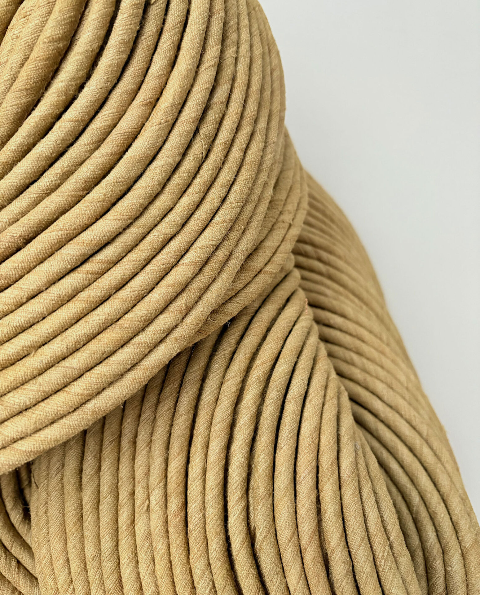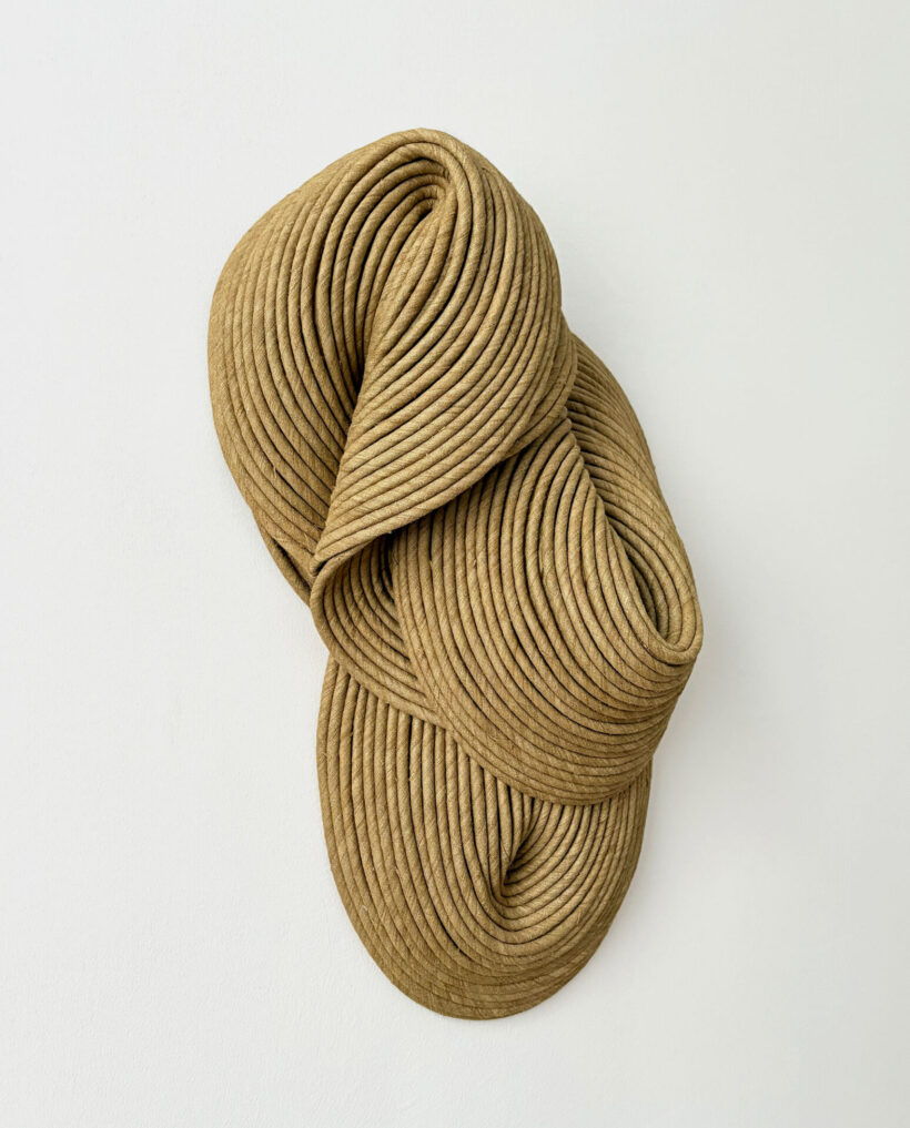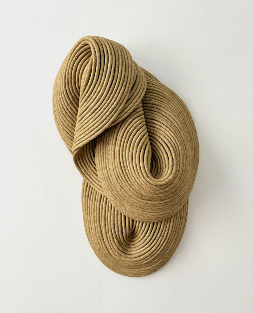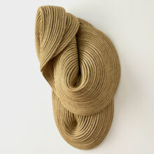Sini Villi (b. 1980, Nivala) is a textile artist based in Helsinki, Finland. In her work Villi uses handmade natural ribbon to create three-dimensional textile wall sculptures. The ribbon is layered, sewn and shaped into a sculpture, which, when hardened from within, retains its unique form. The visual language of the textile sculptures draws its inspiration from Sini Villi’s roots in Northern Ostrobothnia, by the vast and silent natural landscape. Every autumn large fields are ploughed, forming softly rhythmic grooves. The colour scheme becomes one-dimensional, but the adjacent shapes create a visually interesting and soothing view. In the spring, life fills the ground again and the colours return.